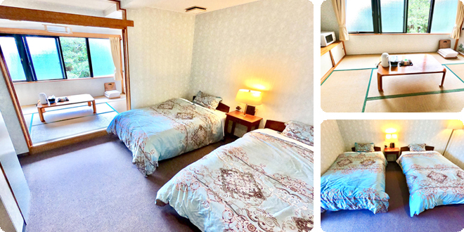 ・お部屋の広さ 20畳 ・定員 3〜5名 ・ベッドサイズ セミダブル(120cm×200cm)×2 ・チェックイン・チェックアウト 16:00/10:00※21:00過ぎにチェックインの場合は必ずご連絡下さい。・高速インターネット環境 接続無料 Wi-Fiルーター貸出